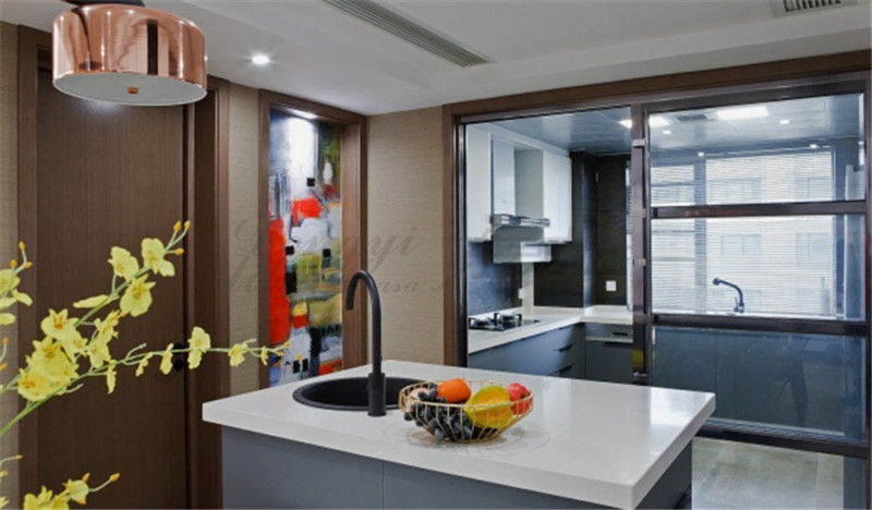 东易力天郑州装修公司设计师认为吧台是做为隔断的方法之一,吧台形式可以砖砌、木工、橱柜等,也可以直接一张吧台桌。吧台做隔断既不破坏空间延展,又兼具功能。