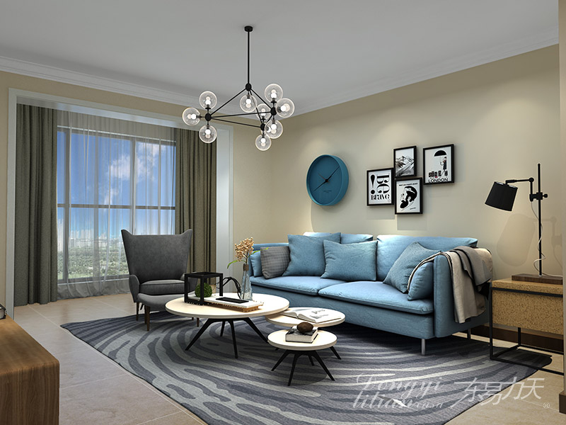 2019-01-17郑州装修公司|120㎡现代简约风,用心感悟生活的质感客厅采用的浅蓝色布艺沙发搭配同色系的柔软抱枕,深褐色的单人靠椅,三个圆形大小不一的白色木桌,结合深灰与浅灰色相间的地...