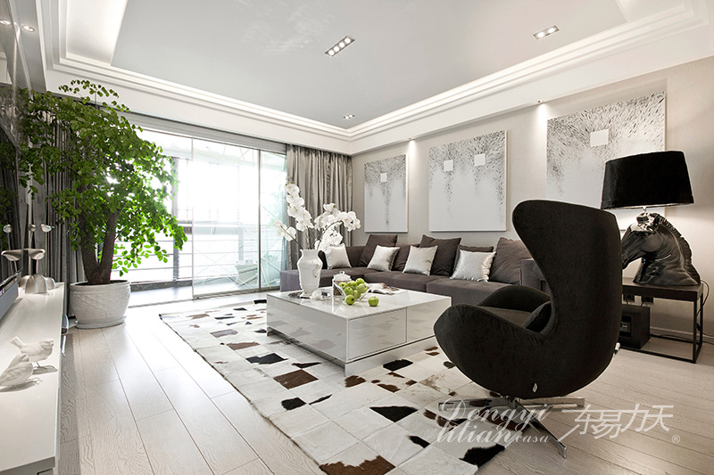 2019-01-24深色的沙发,白色的茶几,白色乳胶漆墙面,白色的花纹木质地板,宽敞明亮的阳台,简单而又不失现代元素的感觉。郑州装修公司|120㎡现代简约,经典黑与白...