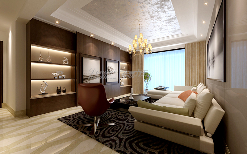 2019-01-08郑州装修公司|后现代简美混搭风,将轻奢进行到底!时尚个性的后现代风格,深色花纹的地毯装饰,浅色时尚的布艺沙发,同时在装饰中使用深色装饰背景墙,让客厅即有时代魅力同时...