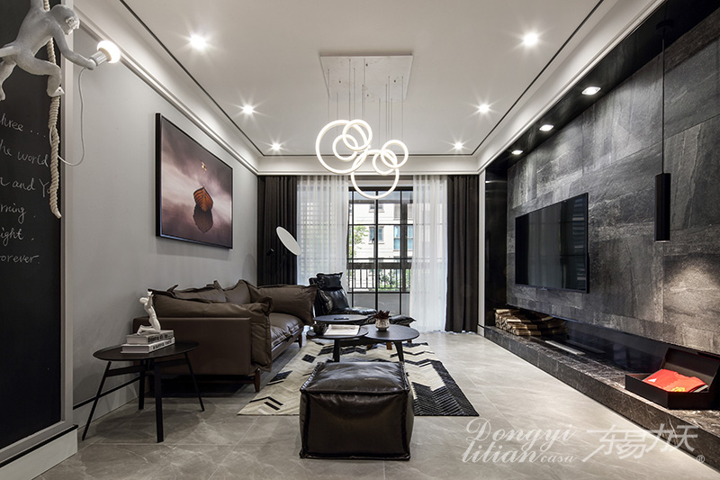 2019-04-10客厅以黑白灰为主色调,整个电视背景墙使用黑灰色瓷砖打造,现代质感十足。郑州家装公司|现代风黑白配,现实版的“回家的诱惑”...