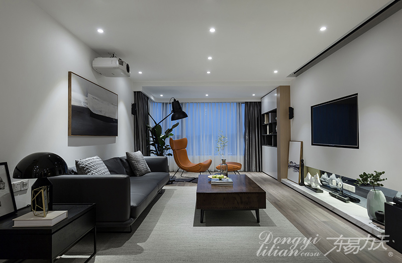 2019-04-16客厅以黑白灰为基调,深褐色多人沙发,深咖色茶几,浅灰色的地毯,同时在客厅中使用橘黄色和绿色进行点缀,使用麻、纱、椰织等材质,体现出现代风格的自然质朴。郑州装修公司...
