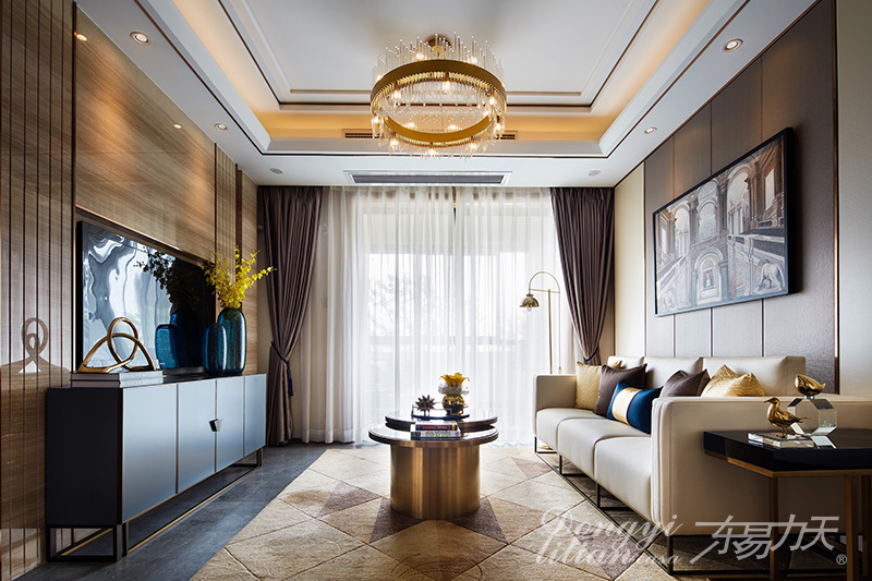 2019-04-17客厅以金色为主色调,整体墙面装有护墙板,通过设计语言塑造出简约舒适的生活场景,传递美好的生活态度。郑州装饰公司|极致新中式,演绎舒适、精致的生活方式...