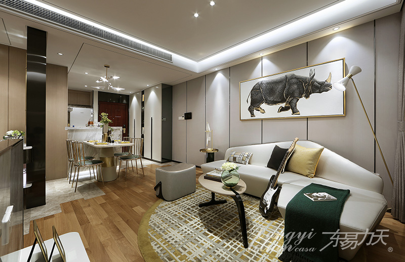 2019-04-19厨房、餐厅延伸至客厅,地面运用石材与木质穿插拼接的方式,巧妙结合,形成不同的功能空间。郑州装饰公司|79㎡现代轻奢,简洁中带有品质感...